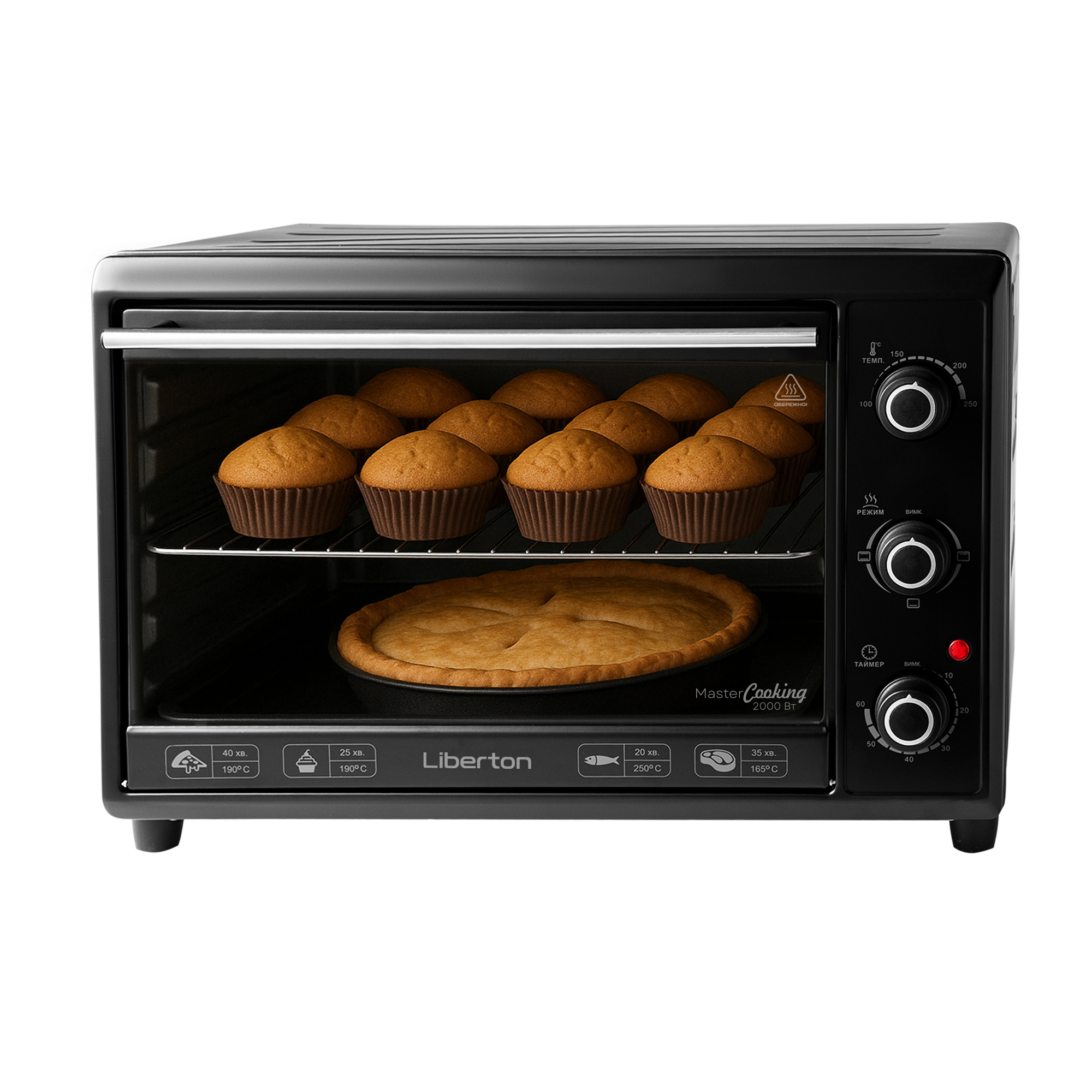 Об'єм: 40 л; Висота внутрішньої камери: 29 см; Потужність: 2000 Вт; Термостат: 250 град.; Комплектація: решітка, прямокутне деко, тримач для дека; Скло в дверцятах: 1; Режими приготування: 3; Управління: механічне; Внутрішнє покриття: цинкове; Розмір виробу: 55,9x38,4x40,5 см; Колір: чорний.