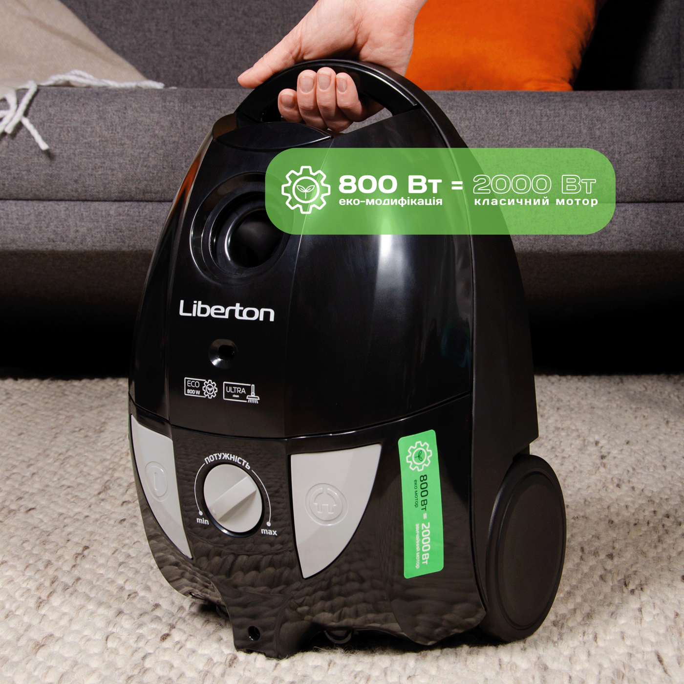 Потужність: 800 Вт; Тип: мішковий; Об'єм пилозбірника: 2,5 л; Комплектація: телескопічна хромована трубка, насадки підлога/килим/щілина, шнур 4,5 м; Фільтр: HEPA, синтетична губка; Опції: поворот шланга на 360 градусів, регулятор потужності; Розмір виробу: 22,8х27,3х40,6 см; Колір: чорний.