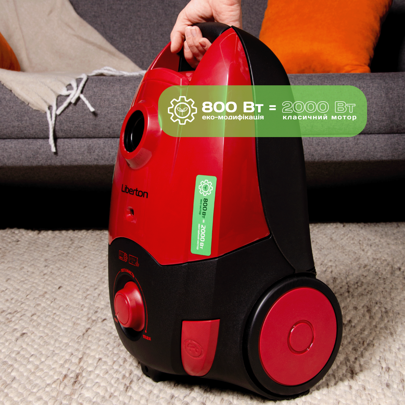 Потужність: 800 Вт; Тип: мішковий; Об'єм пилозбірника: 5 л; Комплектація: телескопічна хромована трубка, насадки підлога/килим/щілина, шнур 4,5 м; Фільтр: HEPA, синтетична губка; Опції: поворот шланга на 360 градусів, регулятор потужності; Розмір виробу: 24,5х34х49 см; Колір: червоний.
