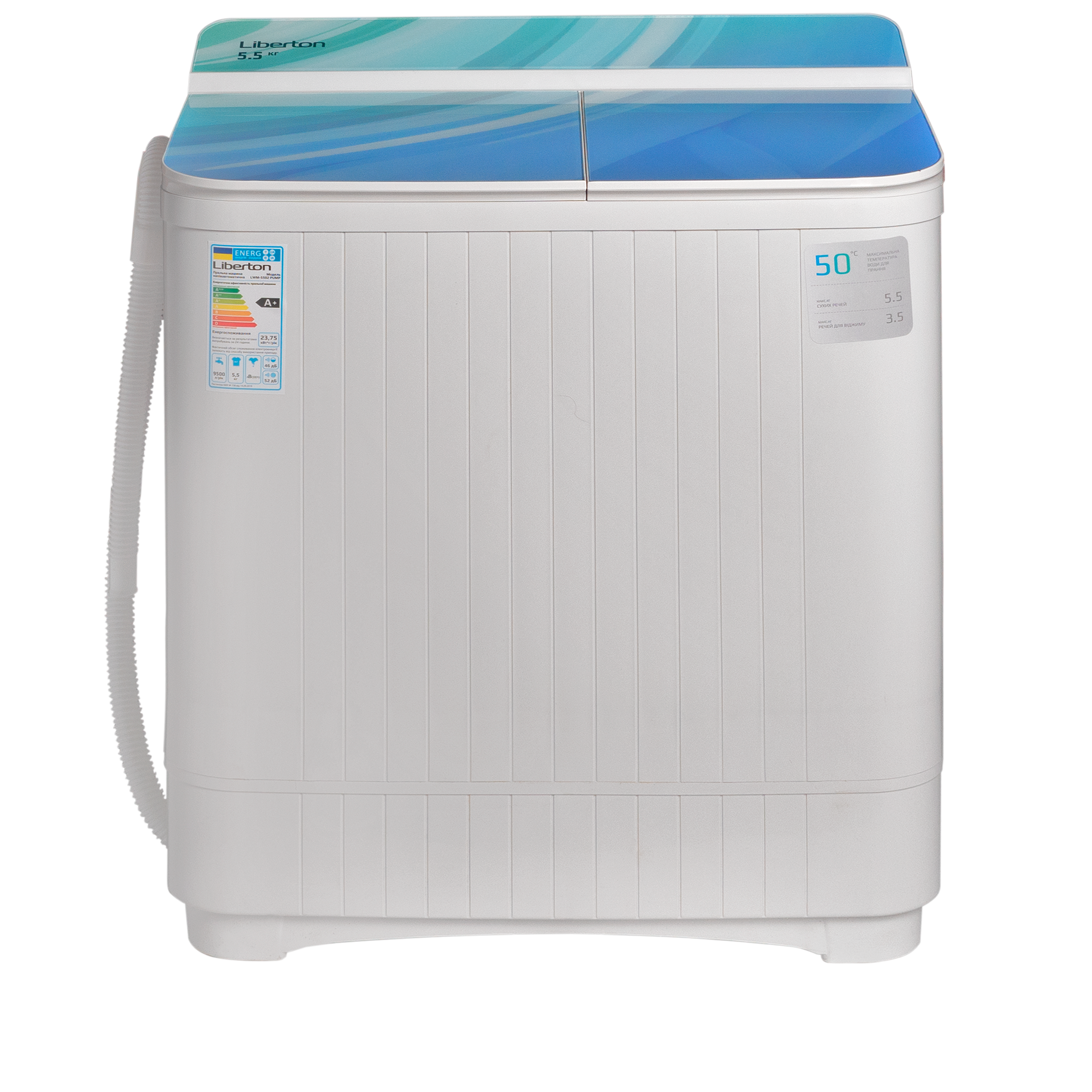 Завантаження: 5,5 кг; Потужність: 380 Вт; Тип: напівавтомат, двобакова; Режими роботи: делікатне прання, стандартне прання, злив; Таймер: 15 хв .; Помпа для відкачування води; Центрифуга; Клас енергоспоживання: А; Рівень шуму: 52 дБ; Матеріал кришки: скло з принтом; Матеріал корпусу: пластик; Розмір виробу: 68х38х74 см; Колір: білий.
