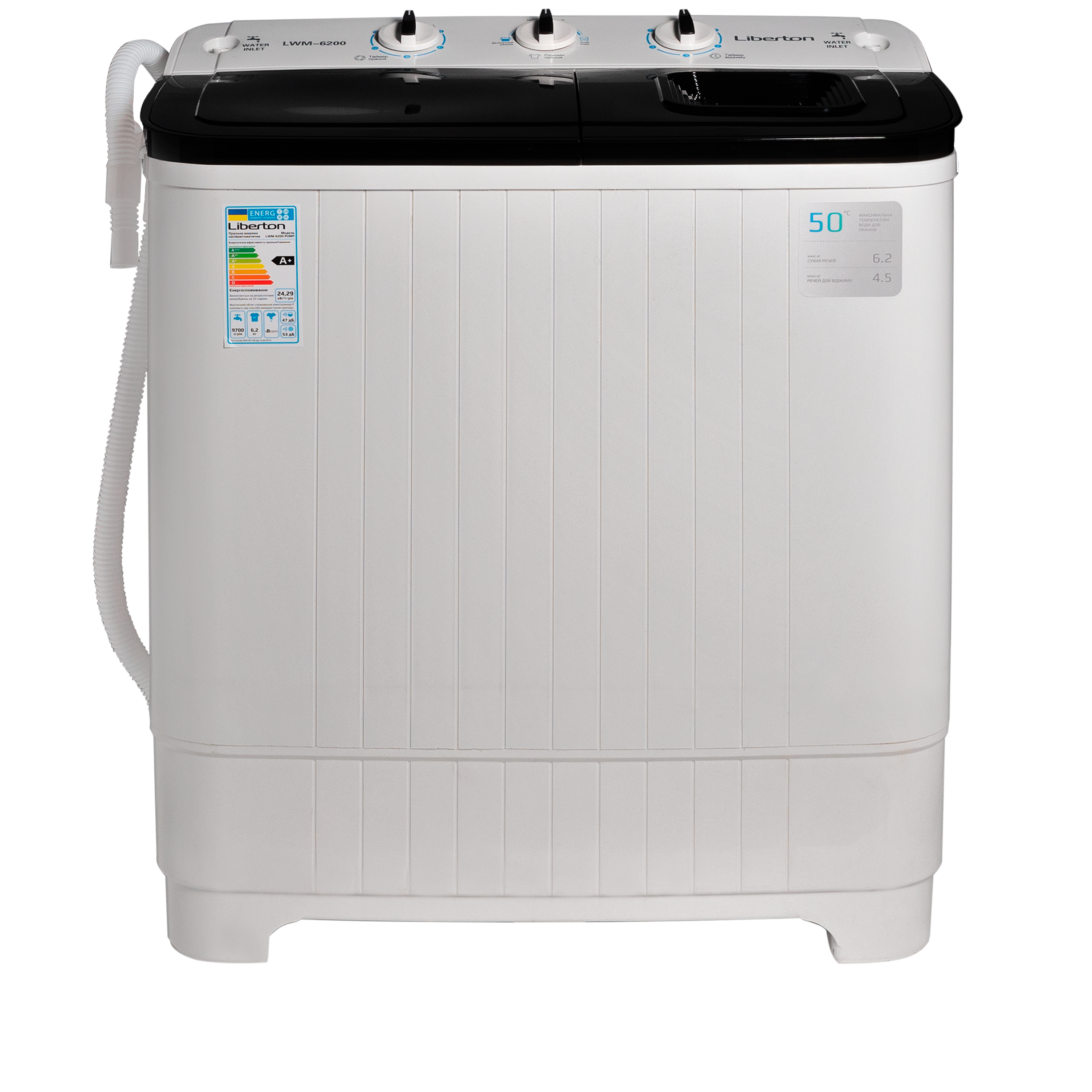 Завантаження: 6,2 кг; Потужність: 380 Вт; Тип: напівавтомат, двобакова; Режими роботи: делікатне прання, стандартне прання, злив; Таймер: 15 хв .; Помпа для відкачування води; Центрифуга; Клас енергоспоживання: A+; Рівень шуму: 53 дБ; Матеріал кришки: кольоровий пластик; Матеріал корпусу: пластик; Розмір виробу: 66,8х40х76,5 см; Колір: білий+чорний.