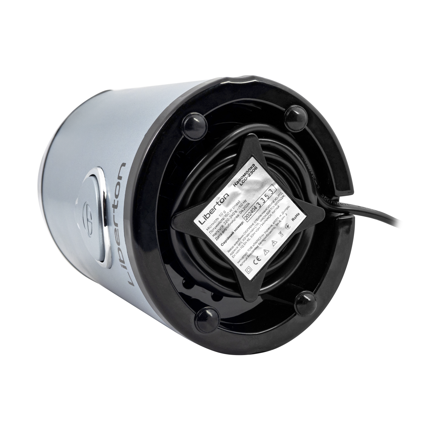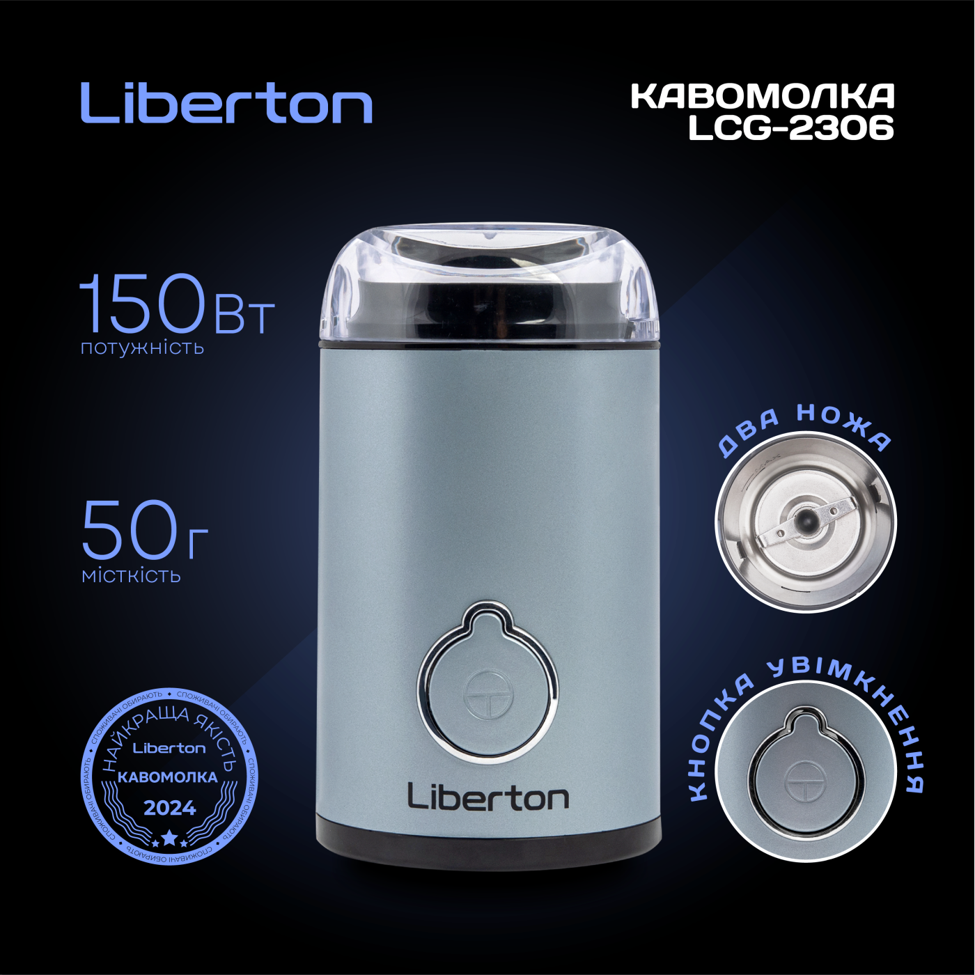 Потужність: 150 Вт; Місткість контейнера для зерен: 50 г; Імпульсний режим; Контейнер з нержавіючої сталі; Ударний ніж з нержавіючої сталі; Відсік для зберігання шнура; Блокування включення при знятій кришці; Розмір виробу: 9,0х18,2х10,3 см; Матеріал корпусу: пластик; Колір: блакитний.