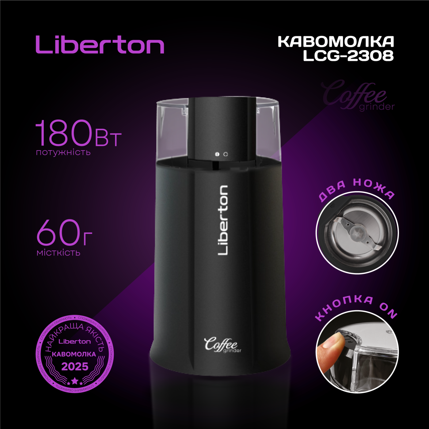 Потужність: 180 Вт; Місткість контейнера для зерен: 60 г; Імпульсний режим; Контейнер з нержавіючої сталі; Ударний ніж з нержавіючої сталі; Матеріал корпусу: пластик; Розмір виробу, см: 9,8х18,4х9,8; Колір: чорний.