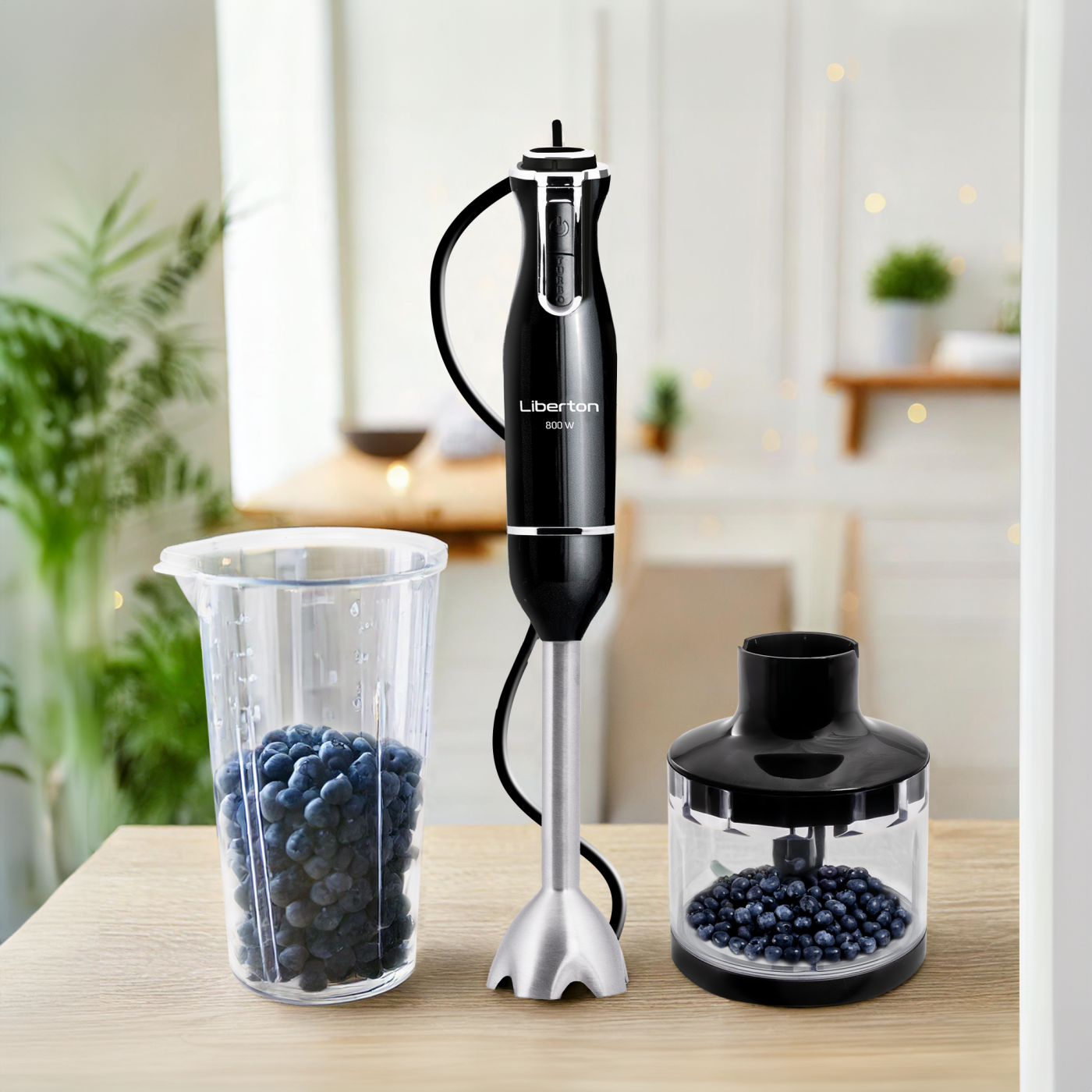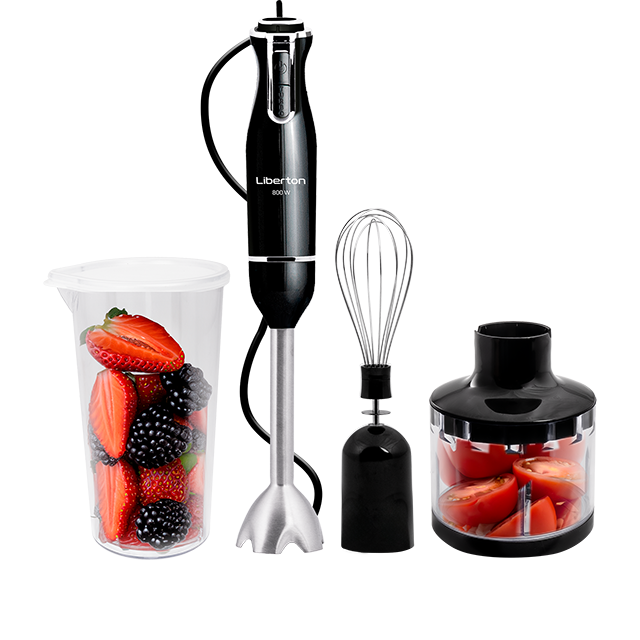 Потужність: 800 Вт; Тип: занурювальний; Кількість швидкостей: 2; Плавне регулювання: так; Турборежим: так; Комплектація: 4 в 1; Аксесуари: насадка "блендер", вінчик для збивання, мірний стакан (600 мл), чаша подрібнювача (400 мл); Ніж: нержавіюча сталь; Матеріал корпусу: пластик; Колір: чорний.