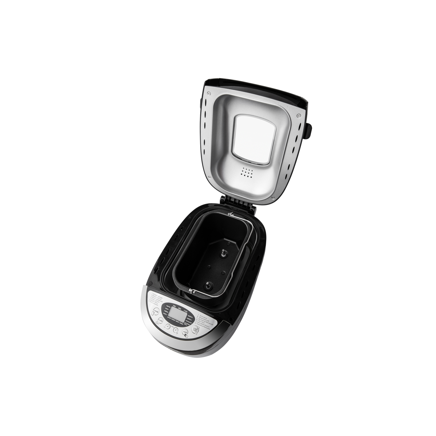 Потужність: 850 Вт; Об'єм випічки: 700/900/1150 г; Кількість програм: 12; Форма випічки: прямокутна; Додаткові функції: підтримка температури, відстрочка старту, 3 рівня запікання скоринки, звуковий сигнал; Комплектація: форма з антипригарним покриттям, мірний стакан, мірна ложка, 2 тістоміса, гачок; Матеріал корпусу: пластик; Розмір виробу: 42,2х27,6х27 см; Колір: чорний+металік.