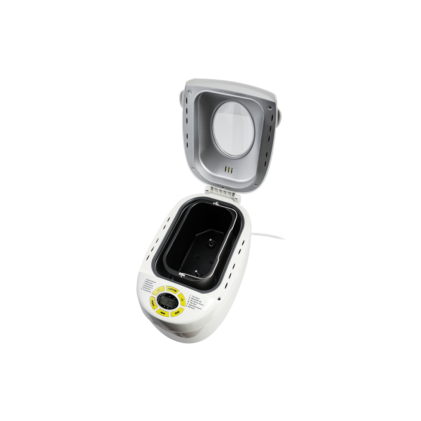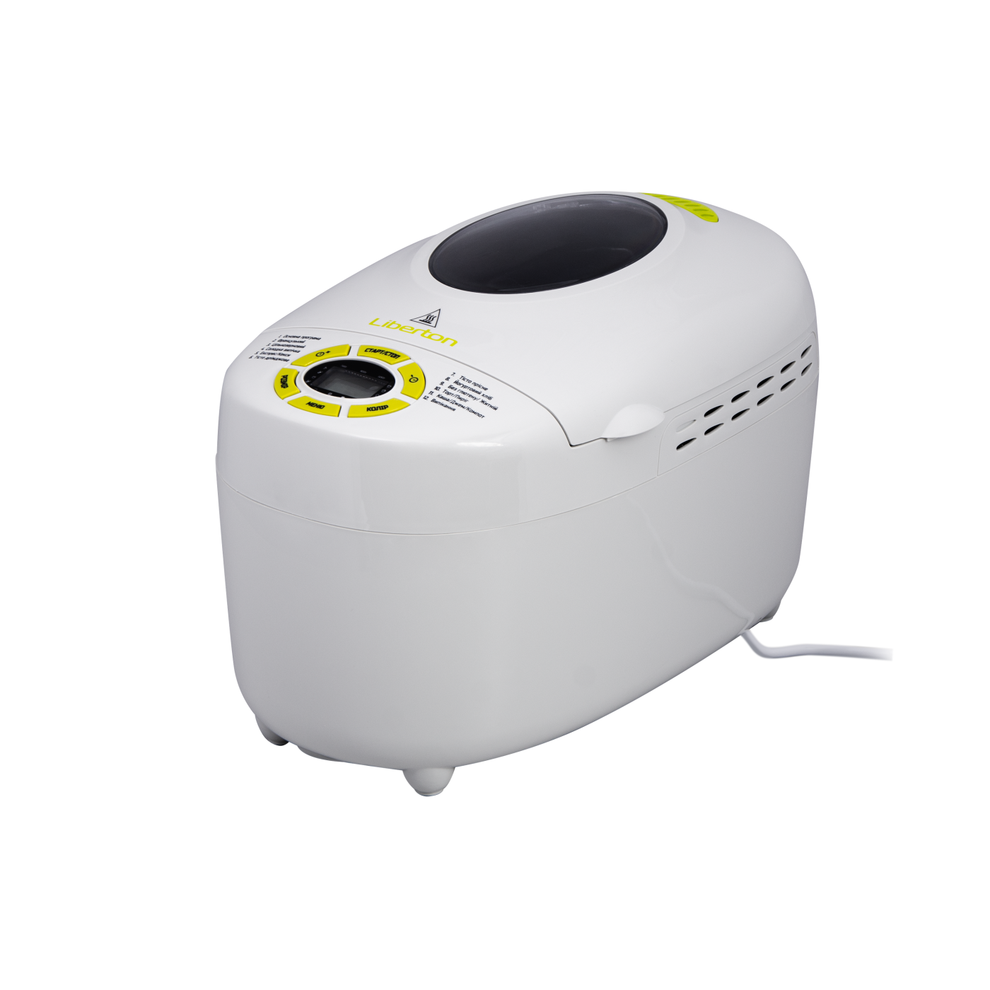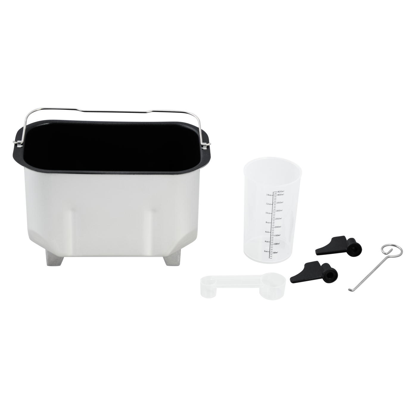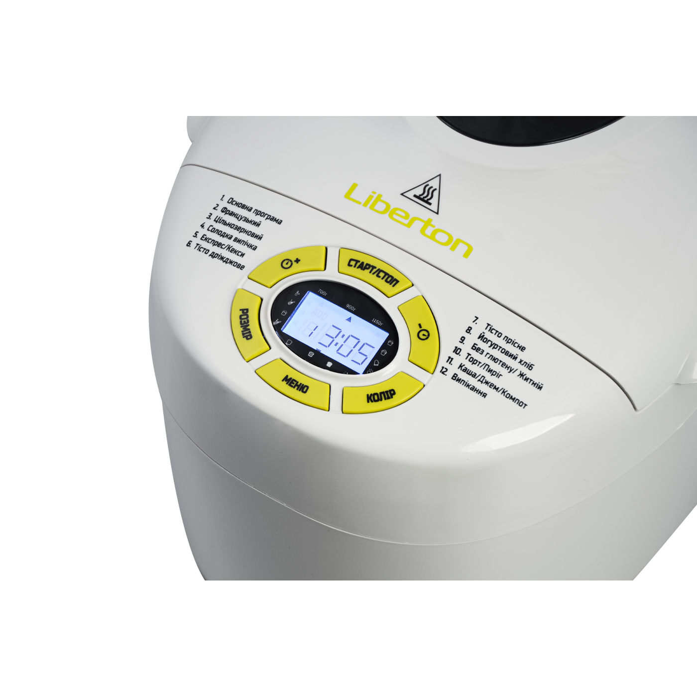 Потужність: 850 Вт; Об'єм випічки: 700/900/1150 г; Кількість програм: 12; Форма випічки: прямокутна; Додаткові функції: підтримка температури, відстрочка старту, 3 рівня запікання скоринки, звуковий сигнал; Комплектація: форма з антипригарним покриттям, мірний стакан, мірна ложка, 2 тістоміса, гачок; Матеріал корпусу: пластик; Розмір виробу: 42,2х27,6х27 см; Колір: білий.