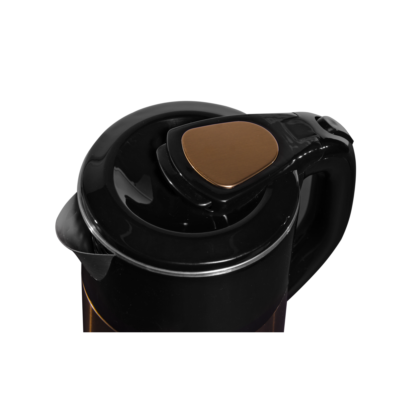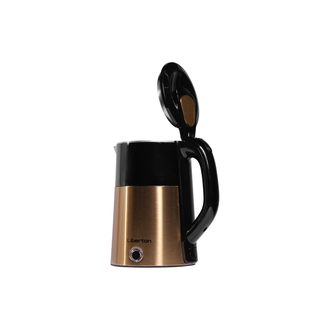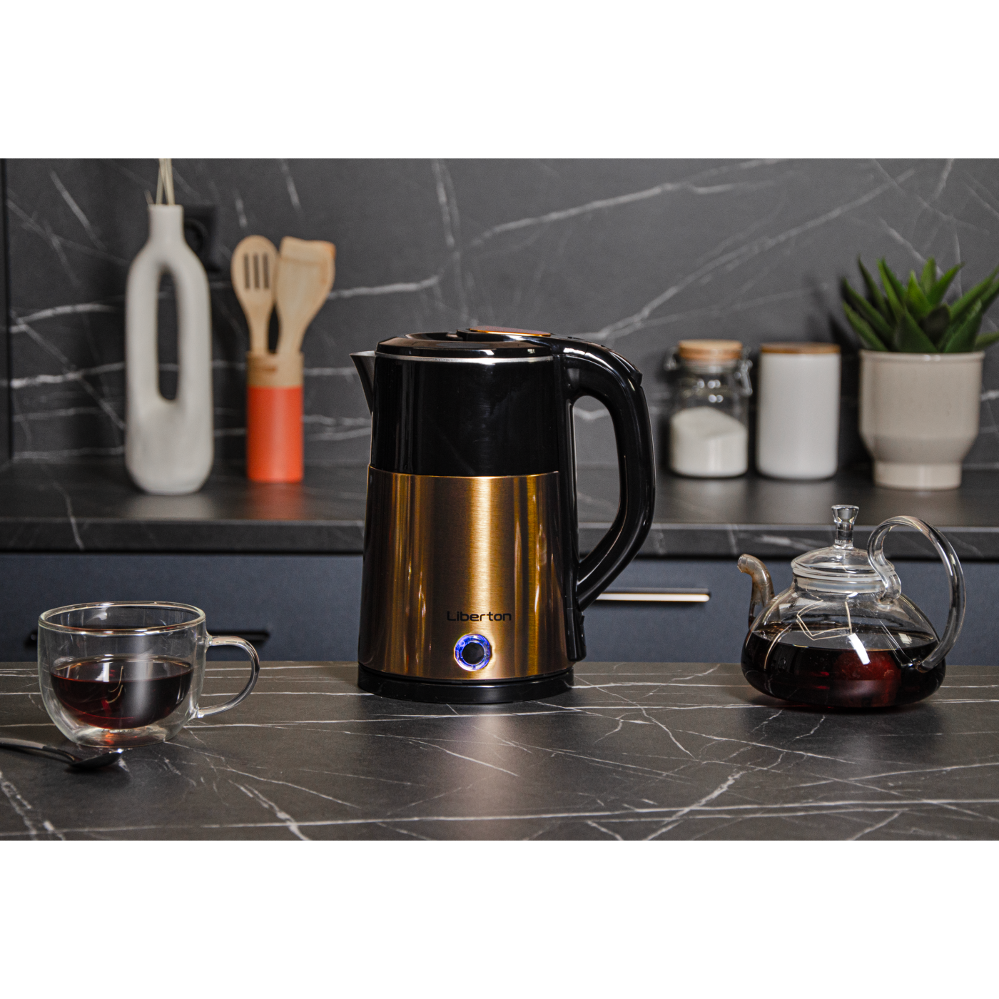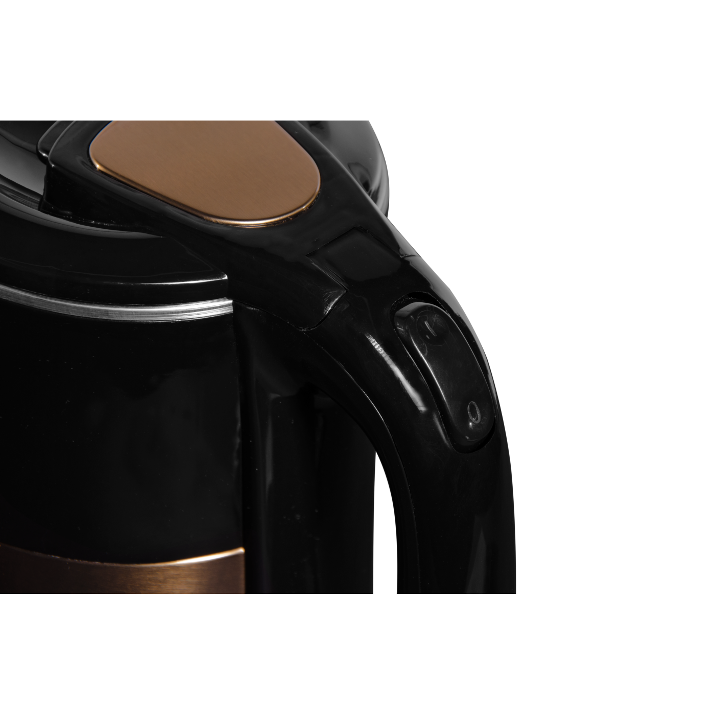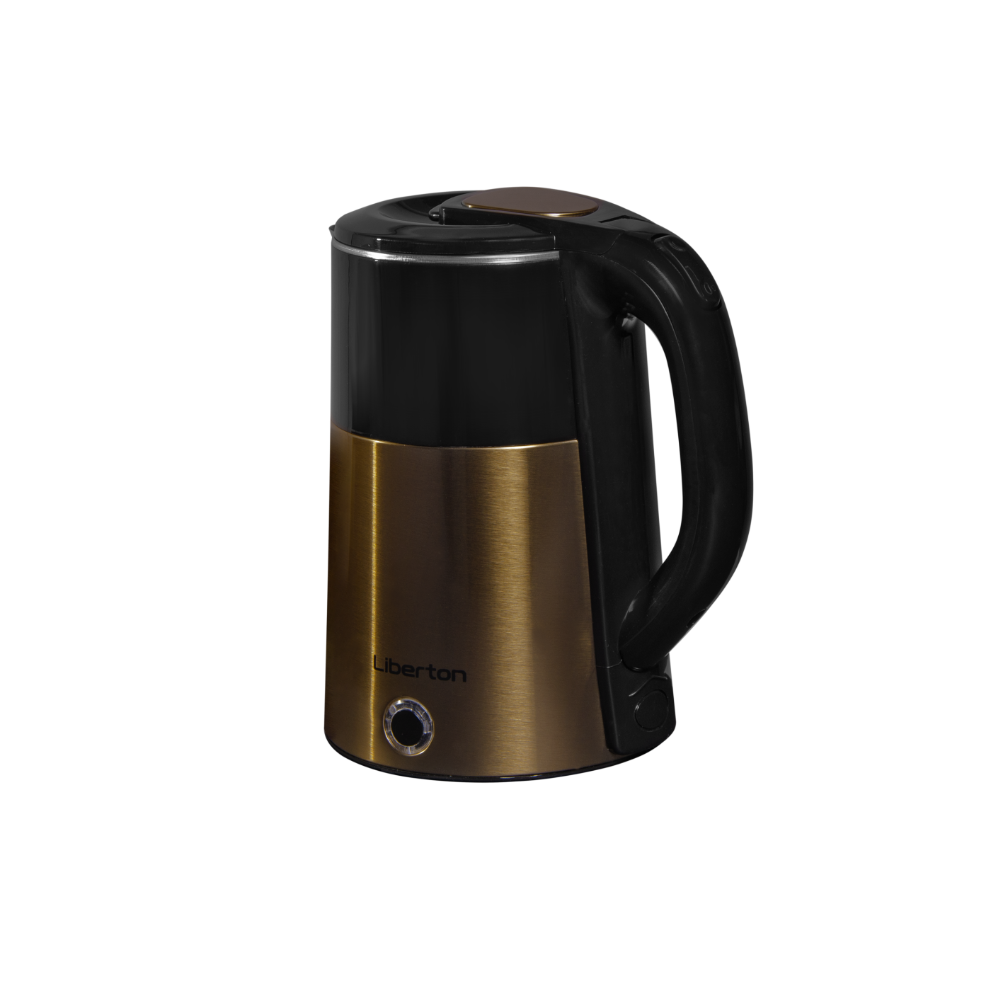 Потужність: 1500 Вт; Об'єм: 1,8 л; Нагрівальний елемент: диск з нержавіючої сталі; Комплектація: поворотна база на 360 град., автовідключення, внутрішня шкала рівня води, індикатор роботи; Розмір виробу: 15,5х21,5х25,5 см; Особливості: безшовна колба; Корпус: подвійна стінка (нержавіюча сталь+пластик); Колір: золотий.