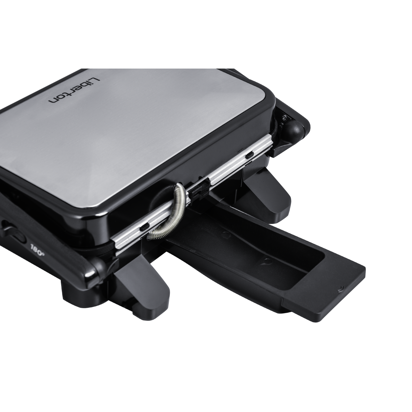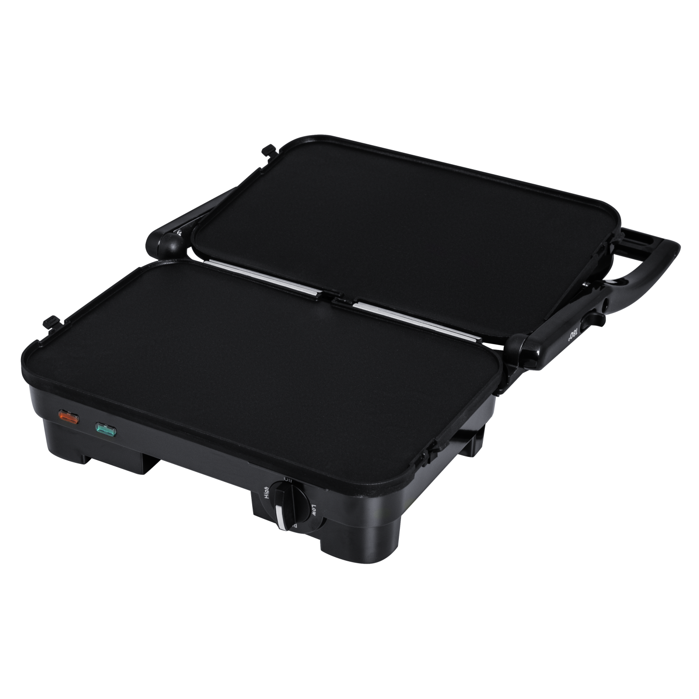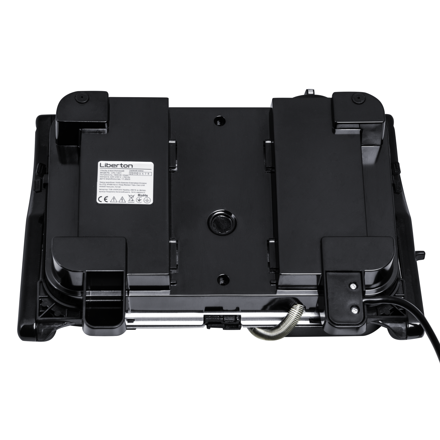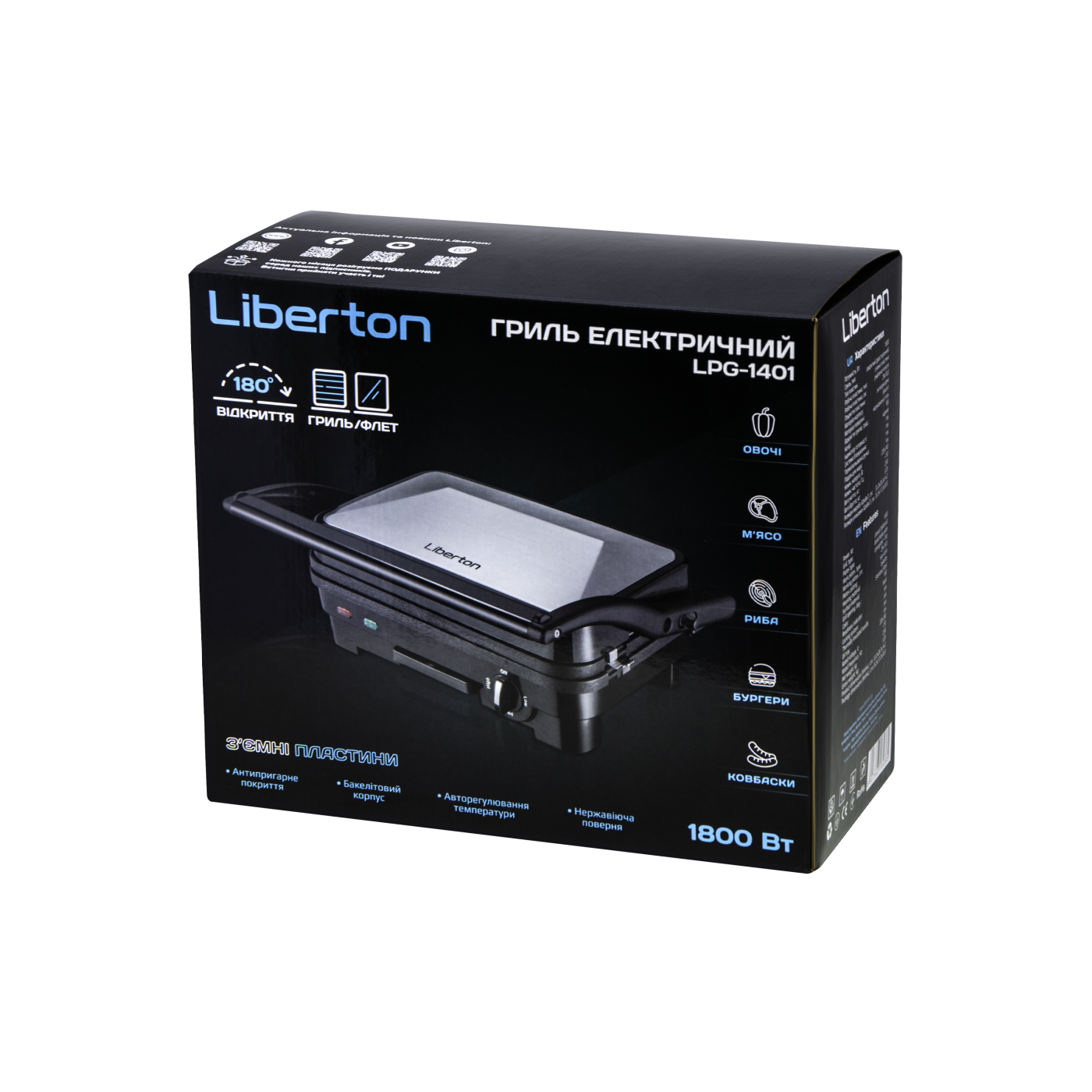 Потужність: 1800 Вт; Тип: контактний; Розмір робочої поверхні: 29х18,8 см; Знімна двостороння пластина (гриль/пласка); Індикатор живлення; Індикатор готовності їжі; Регулятор температури; Система блокування; Термоізольована ручка; Аксесуари: скребок для чищення, піддон для жиру; Покриття пластин: антипригарне; Відкривання: 180 град.; Матеріал корпусу: бакеліт+нержавіюча сталь; Розмір виробу: 33,2х28,3х14,2 см; Колір: чорний+нерж.