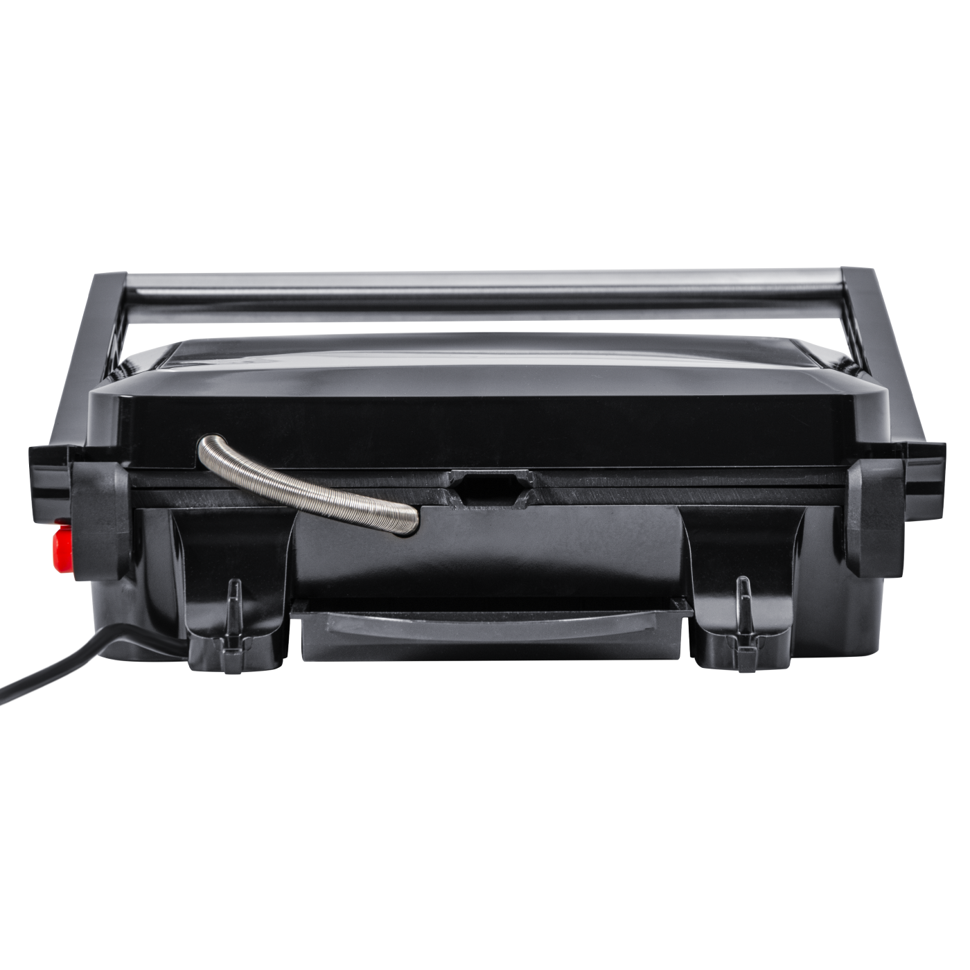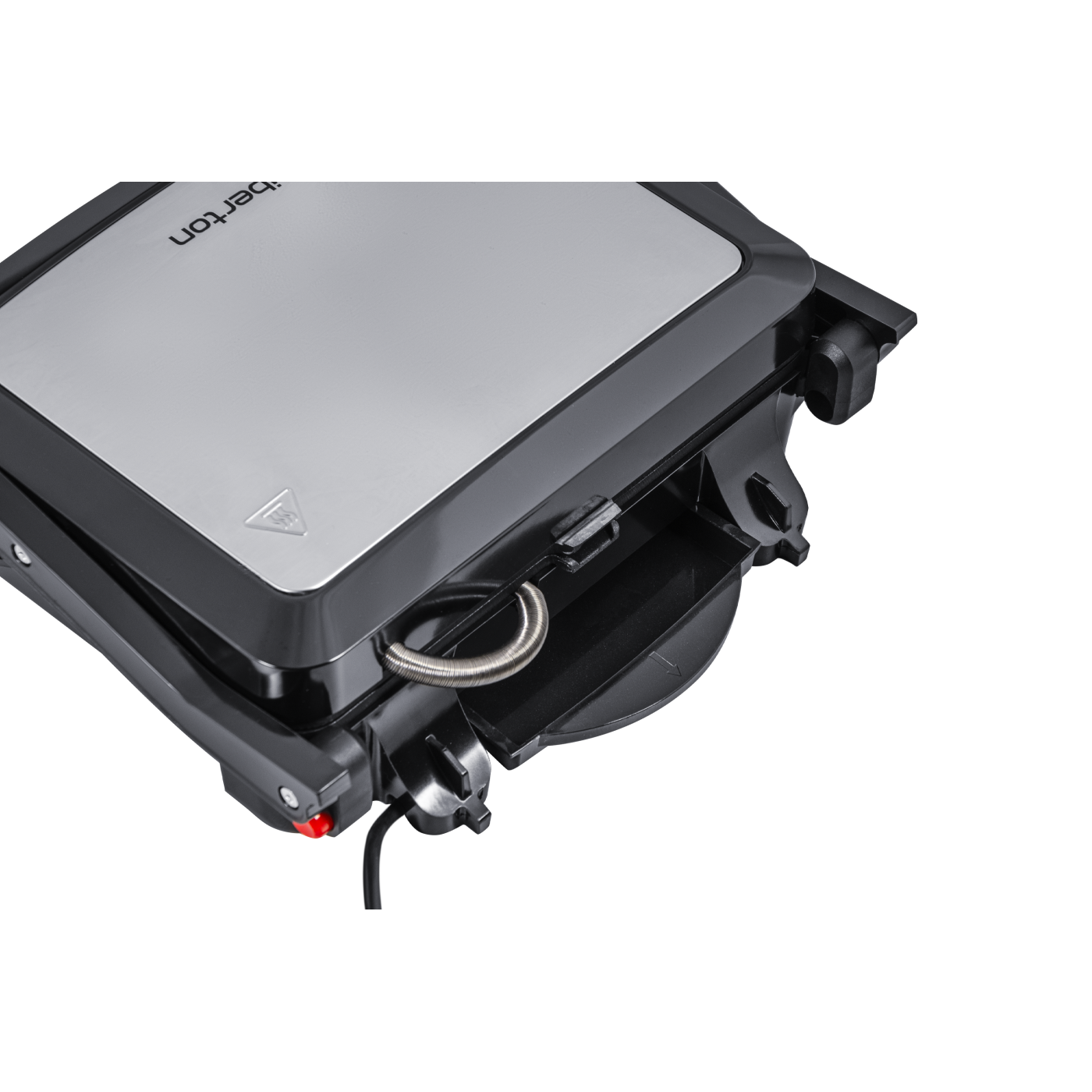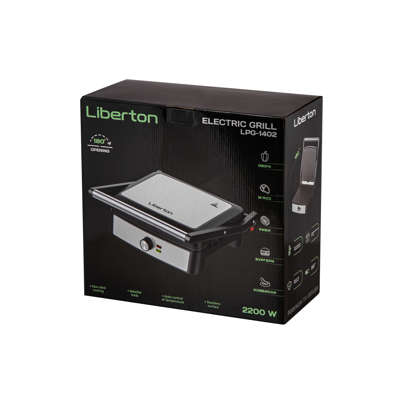 Потужність: 2200 Вт; Тип: контактний; Розмір робочої поверхні: 29х23 см; Індикатор живлення; Індикатор готовності їжі; Регулятор температури; Система блокування; Термоізольована ручка; Аксесуари: скребок для чищення, піддон для жиру; Покриття пластин: антипригарне; Відкривання: 180 град.; Матеріал корпусу: бакеліт+нержавіюча сталь; Розмір виробу: 32,8х13,3х32,3 см; Колір: чорний+нерж.