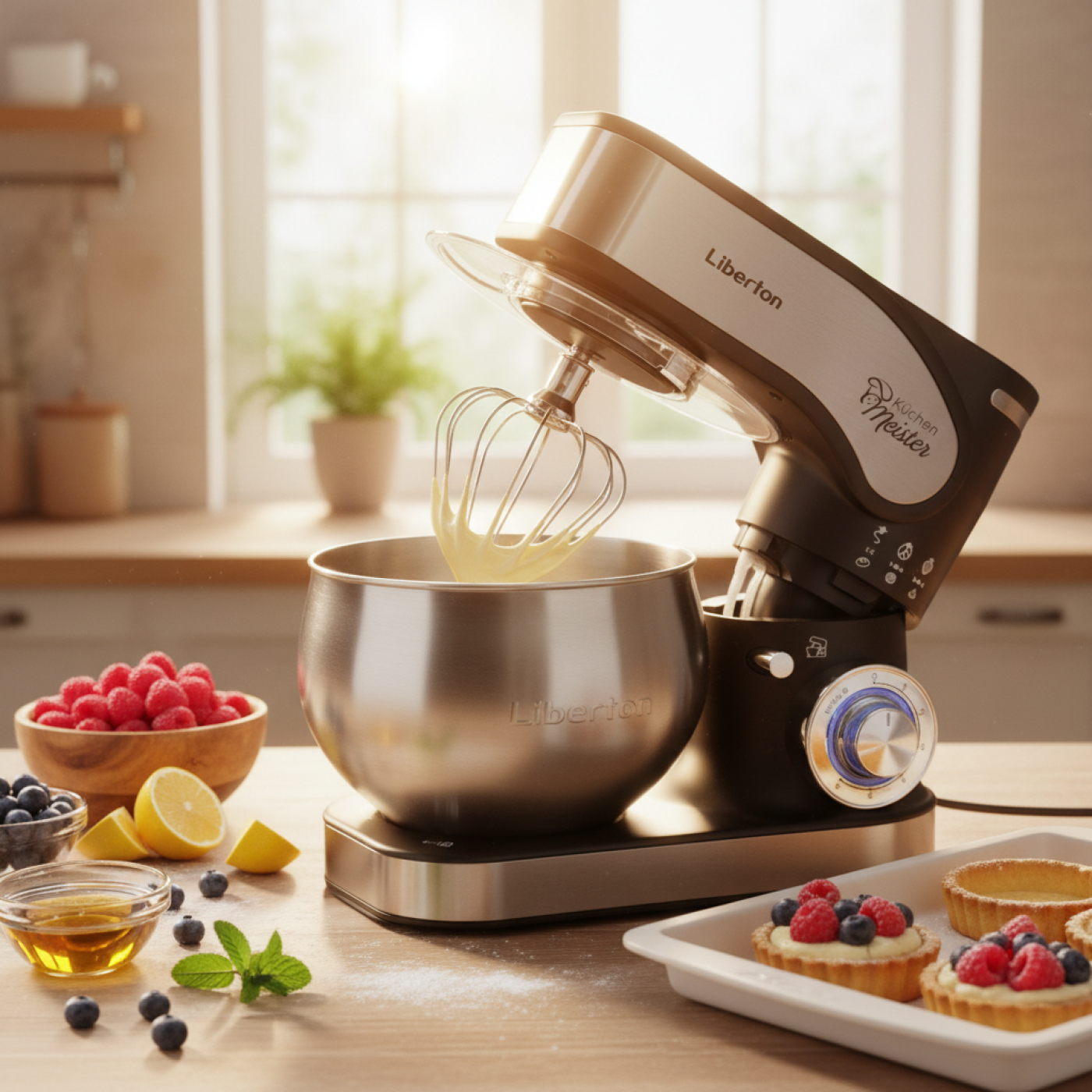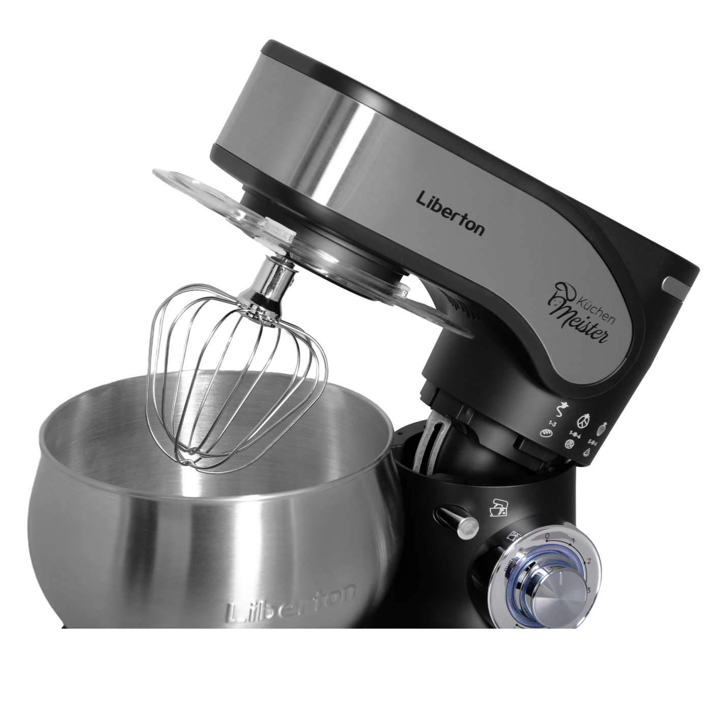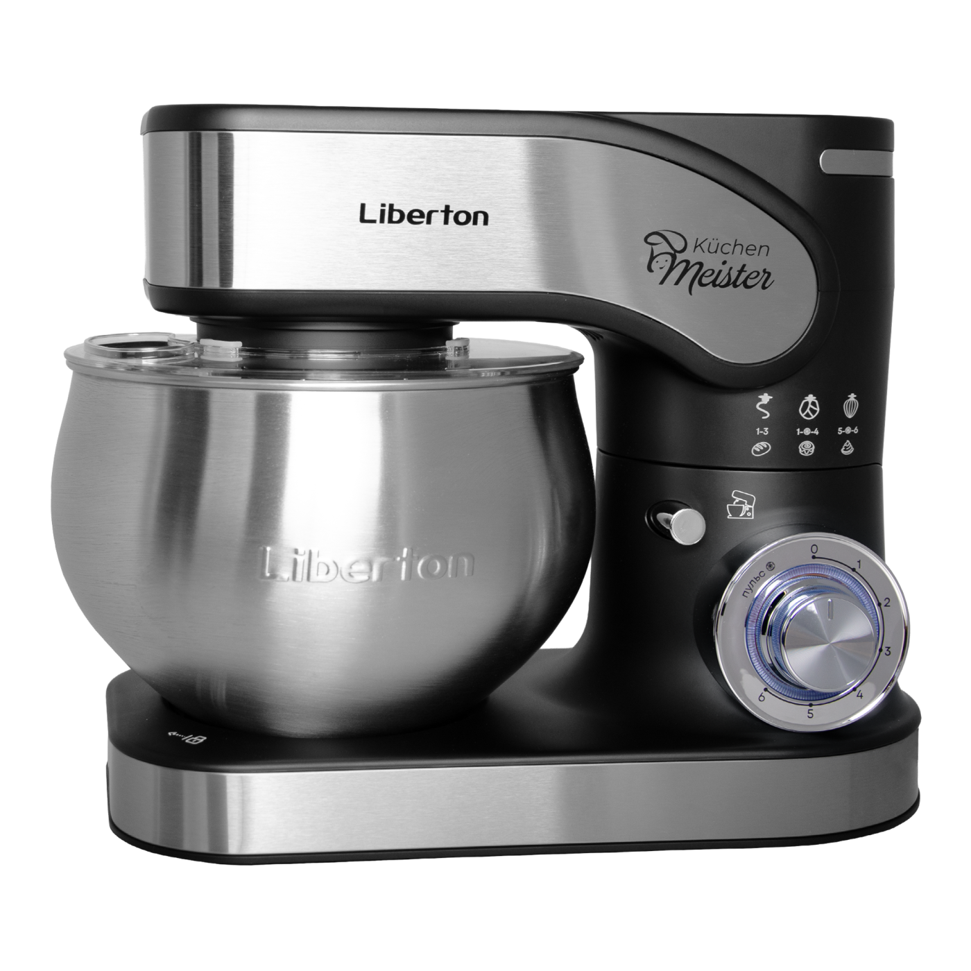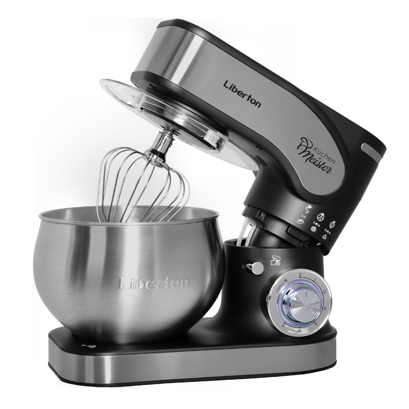 Потужність: 2000 Вт; Кіл-ть швидкостей: 6; Режим "Пульс": так; Насадки: гак для тіста, плоский збивач, вінчик, лопатка з пластику; Матеріал насадок: нержавіюча сталь; Кнопка вилучення насадок: так; Матеріал корпусу: пластик+нержавіюча сталь; Об'єм чаші: 5 л, Матеріал чаші: нержавіюча сталь; Розмір виробу: 37х29х22 см; Колір: чорний + нержавіюча сталь.